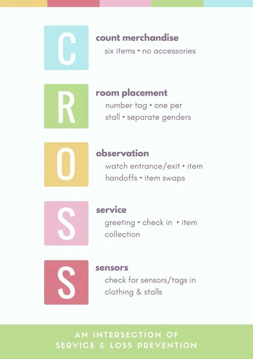 My current job at Forever 21 places a big emphasis on loss prevention as it's up to us the employees to be the face of the company and our product out on the sales floor. In January 2017, as a way to help our store's shrink percentage, I used my experience as a fitting room attendant and corporate loss prevention policy to come up with a program to train employees in proper fitting room procedures, with specific attention to loss prevention techniques. After a few meetings with my managers and using their guidance, I had all the components I felt were necessary when doing a shift in the fitting room. By using these components and placing them in a simple acronym, CROSS, I was able to layout a program that was easy to apply and specific enough to apply to many common situations.