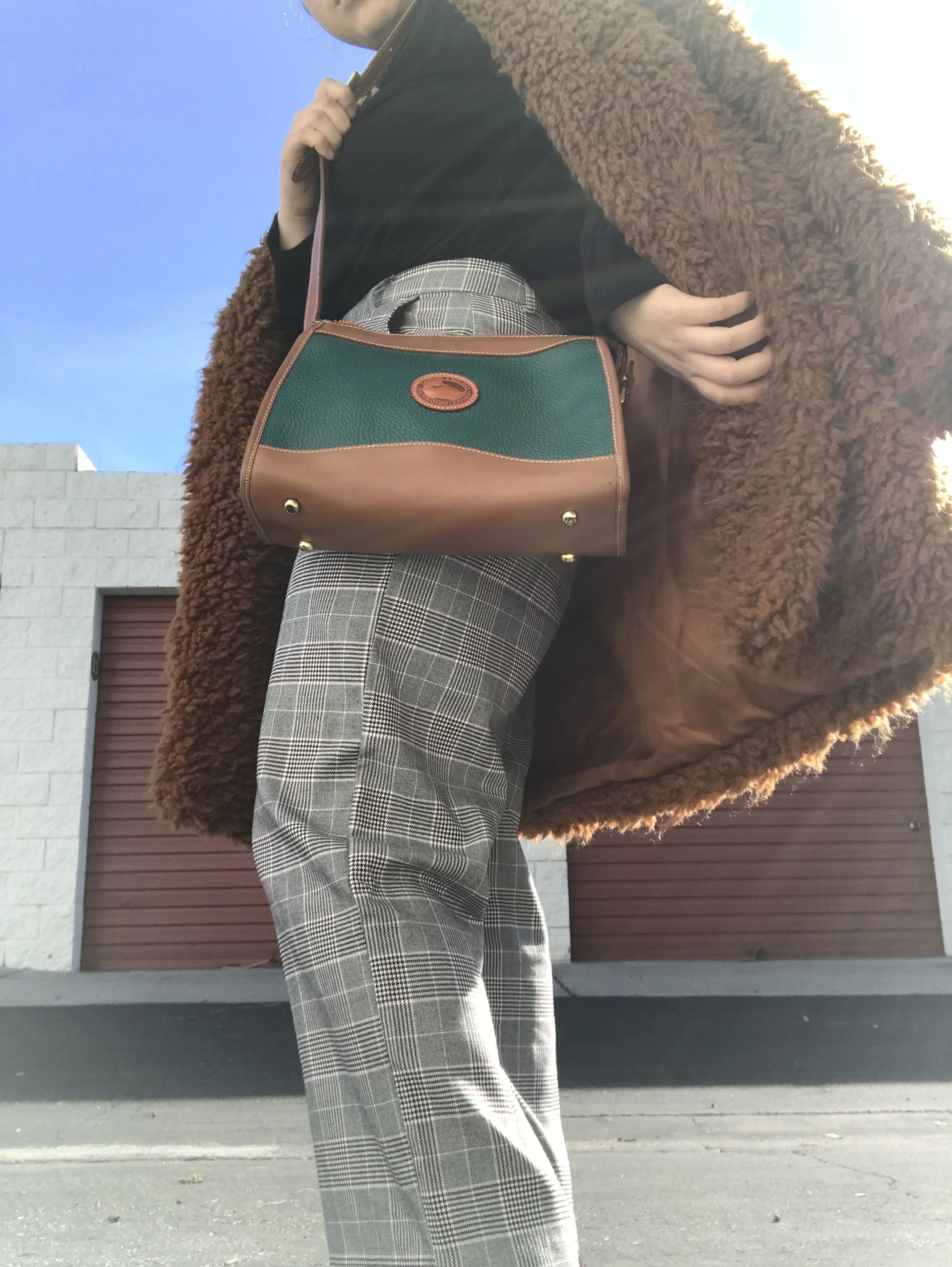 I paired the coat with these totally on trend glen plaid trousers, which I think is a great balance of texture and nicely take away some of the serious vibes that glen plaid has. I also used a thrifted Dooney and Burke green handbag as a pop of color for the outfit.